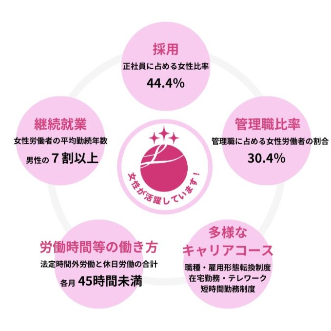 GMOデザインワンでは、女性の採用および管理職への登用を推進すると共に、職種・雇用形態転換制度や短時間勤務制度を設けるなど、女性が活躍できる環境作りに取り組んでいます。この取り組みが評価され、5つの評価項目全てを満たし、「えるぼし認定」の最高位である3つ星を取得に至りました。