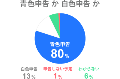 次に青色申告で申告するか白色申告で申告するかを調査しました。結果、80%の個人事業主が青色申告、13%が白色申告で申告するとの結果になりました。会計ソフトの登場によって青色申告をするハードルが低下しており、また白色申告の帳付義務化や青色申告への税制優遇施策により、小規模店舗にも青色申告が浸透していることが判明しました。