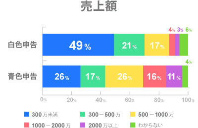 白色申告者の方が青色申告者と比較して、売上は低い傾向にあり、売上300万未満が49%(青色申告者は26%)、300~500万が21%(青色申告者は17%)でした。