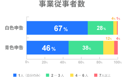 白色申告者は青色申告者と比較して小規模な事業者が多く、従事者1人が67%、2~3人が28%でした。青色申告者も調査対象が個人事業主のため、小規模な店舗が多いですが、白色申告者よりは従事者が多いことが分かります。