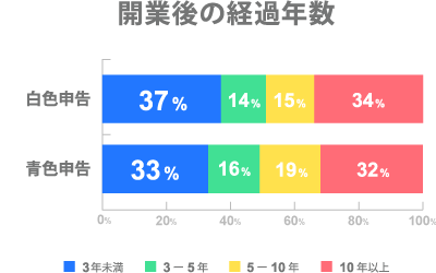 開業後の経過年数は、白色申告者と青色申告者で極端な違いは見受けられませんでした。比較的白色申告者は3年未満もしくは10年以上の事業者割合が多くなっています。
