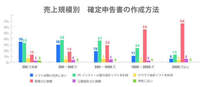 売上が少ないほど、会計ソフトを特に利用しなかったり、PCインストール型の会計ソフトを利用して自ら確定申告書を作成する割合が高いことが分かります。