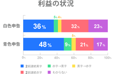 白色申告者は2期連続赤字の割合が32%と、青色申告者(21%)より多く、一方2期連続黒字の割合は白色申告者が36%なのに対して、青色申告者は48%と、白色申告者よりも青色申告者の方が利益を出している割合が多いという結果となりました。