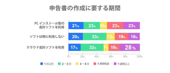 1週間以上要するとの回答が多かったのは、クラウド型会計ソフトを利用した場合で28%。逆にソフトを利用しない場合でも時間はそれほど要していませんでした。