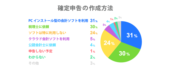 確定申告書の作成をするにあたり、31%の個人事業主がPCインストール型の会計ソフトを利用すると回答。逆に、近年「Fintech(フィンテック)」の一分野として注目されるクラウド会計ソフトの利用は5%に留まりました。