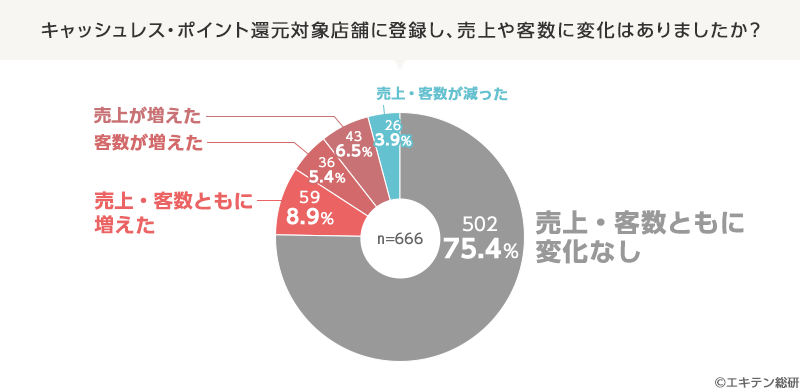 キャッシュレス・ポイント還元対象店舗に登録したことで売上や客数に変化はあったか、という問いに対し、約2割の店舗が「売上・客数が増えた」「売上もしくは客数が増えた」とプラスの回答をするも、7割以上の店舗が「変化なし」と回答。消費者への需要平準化対策として実施されたキャッシュレス・ポイント還元事業は、中小事業者の売上・客数増には寄与しなかったようです。