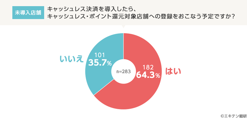 キャッシュレス決済を未導入の店舗に対し、今後キャッシュレス決済を導入したら、キャッシュレス・ポイント還元対象店舗への登録をおこなうか聞いたところ、64.3%の店舗が「登録をおこなう予定」と回答。