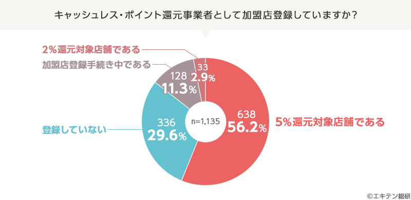 2019年10月からの消費税増税に伴い、需要平準化対策として実施されたキャッシュレス・ポイント還元事業。消費税増税後の9ヵ月間、中小・小規模事業者のキャッシュレス決済導入を支援するもので、調査の結果、70.4%の店舗がキャッシュレス・ポイント還元事業に加盟店登録済み、もしくは登録申請中と回答しました。