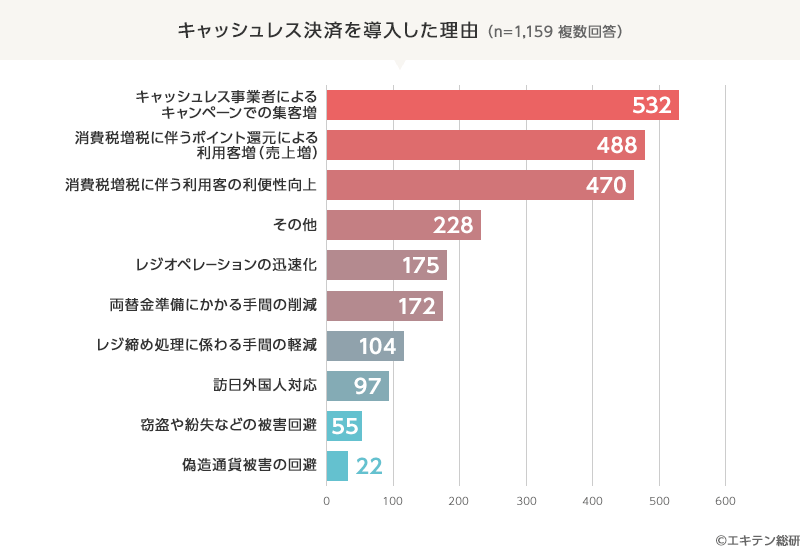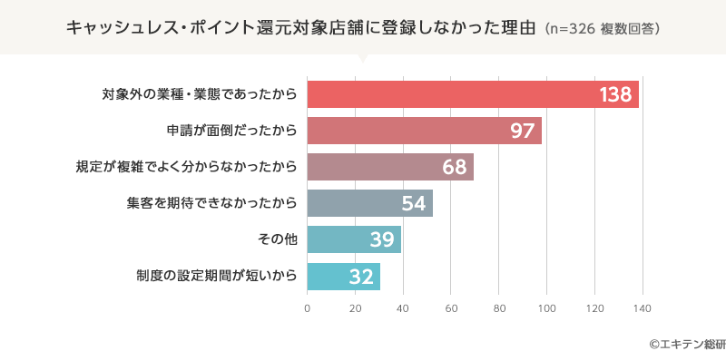 キャッシュレス・ポイント還元対象店舗に登録しなかった理由としては、「対象外の業種・業態であったから」という回答が多数となりました。保険診療を実施している医療機関や、自動車売買などの取引は還元事業の対象外となるほか、対象となる「中小企業・小規模企業者」の定義も業種別に従業員数や資本金/出資総額などで異なります。「申請が面倒だから」「規定が複雑でよく分からなかったから」と回答した店舗も多かったように、規定や申請方法の理解が足りず申請に至らなかった店舗が一定数いたことがわかります。