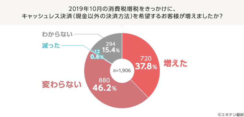 全国の中小事業者において、2019年10月の消費税増税をきっかけにキャッシュレス決済を希望するお客様が増えたか、という問いに対し、37.8%の店舗が「増えた」と回答。