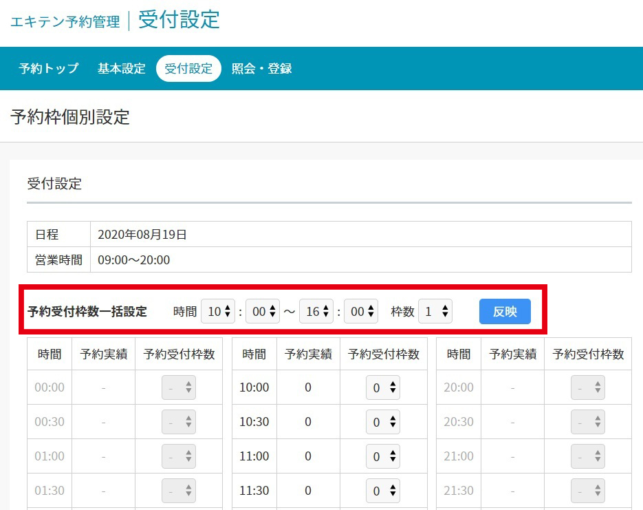 機能改修後は、指定した範囲の時間について、予約受付枠数を一括で変更できるようになりました。数時間分・1日分を一括で変更することが可能です。また、営業時間内の枠をすべて「0」にすることで、「休業日」「予約を受け付けない日」の設定も簡単にできます。