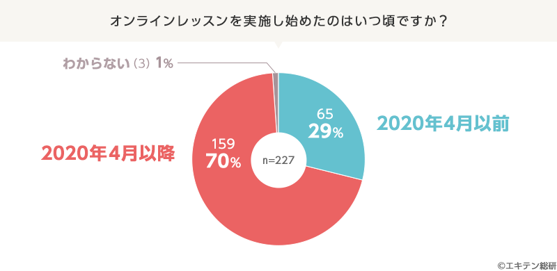 2020年7月、弊社が運営する中小事業者の研究機関「エキテン総研」が実施した調査において、エキテン掲載中の店舗でオンラインレッスンを実施している教室に、実施し始めた時期を質問したところ、実に7割の店舗が2020年4月以降と回答しています。緊急事態宣言下の営業自粛で、オンラインでのレッスン需要が増え、サービス提供を始めた教室が多くあったようです。
