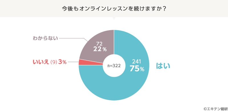 今後もオンラインレッスンを続けますか?という問いに対し、実に75%の店舗がはい、と回答。コロナの余波が続いている状況を鑑みると、今後も継続してオンラインレッスンを実施していく方針の教室が多いようです。