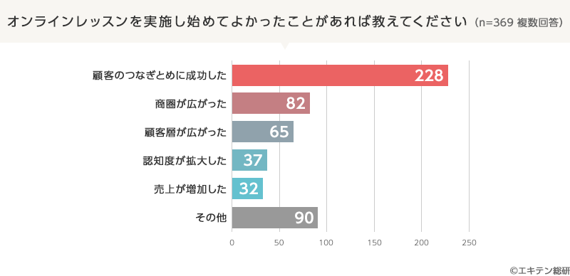 オンラインレッスンを実施し始めてよかったこととして、回答した369店舗中、228店舗が「顧客のつなぎとめに成功した」と回答。休業中も、生徒さんやお客様とのコミュニケーションを絶やさないことで、顧客の繋ぎ止めに成功した教室が多かったようです。