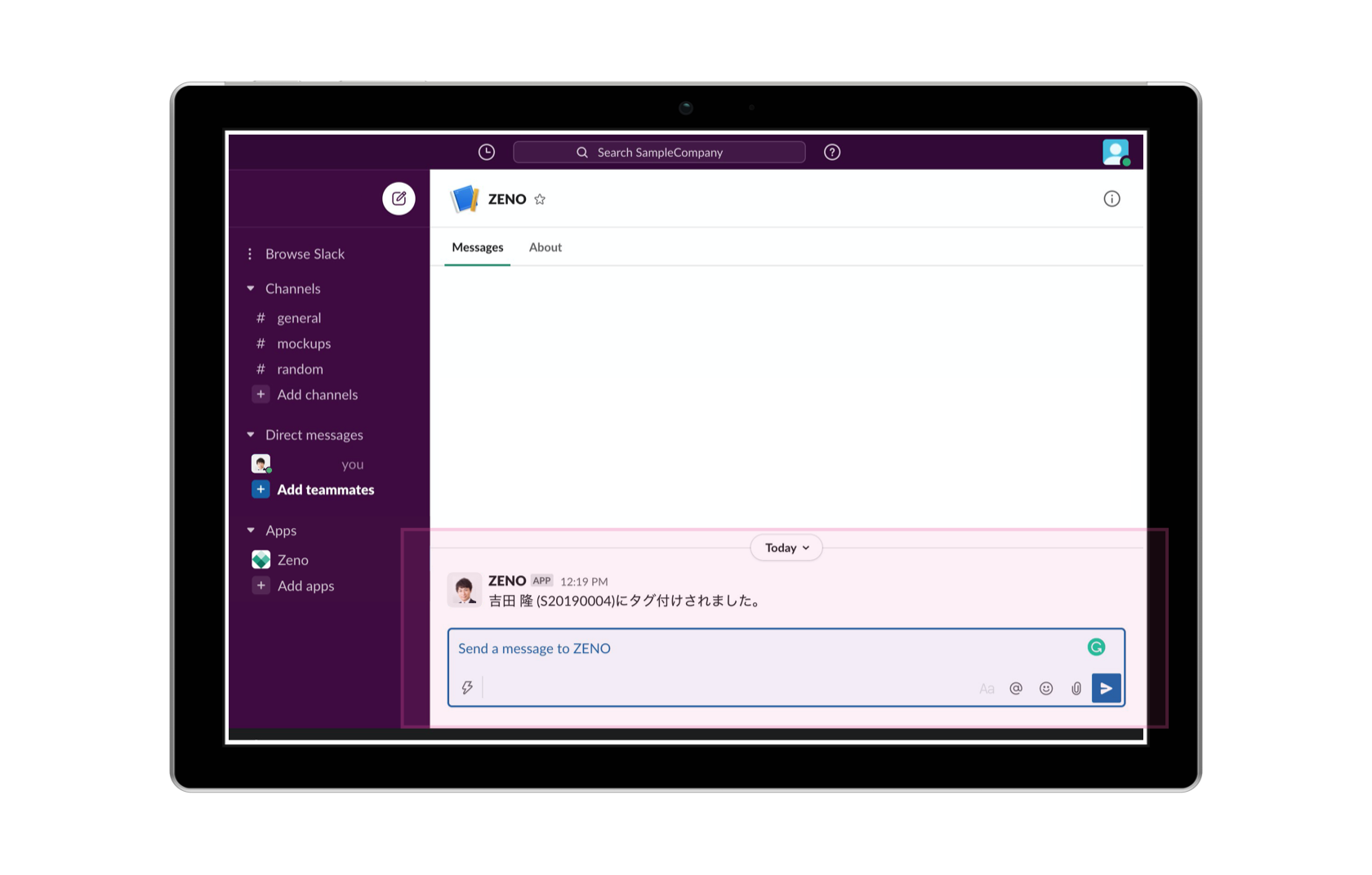 チャンネルをベースとしたメッセージプラットフォーム「Slack」との連携を行うと申請の承認・回覧依頼、会議室予約の参加依頼、日報などの投稿時などで送られるZENOの通知をSlack上でも受信することができるようになります。