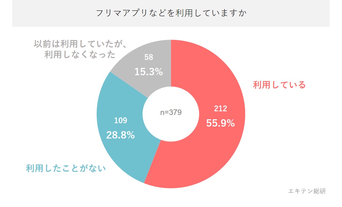 フリマアプリなどの利用経験についてたずねると、「利用している」、「以前は利用していたが利用しなくなった」と回答したユーザーは7割にのぼり、利用経験のある人の多さが分かります。