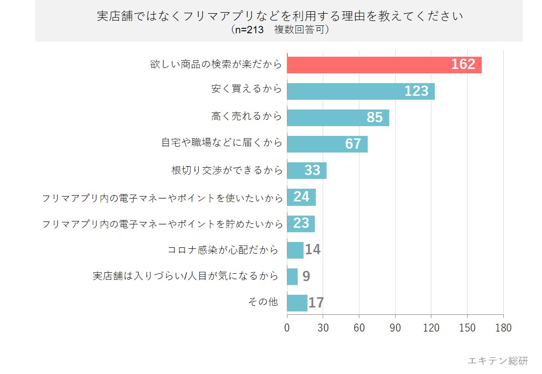 実店舗ではなくフリマアプリなどを利用する理由については、「欲しい商品の検索が楽だから」という回答が最も多くなりました。取り扱い商品がリサイクル品であるという特性上、実店舗をチェーン展開しているリサイクル店でも、店舗ごとの品揃えは異なります。フリマアプリなどでは、欲しい商品のキーワードを打ち込み検索するだけで、日本全国の出品者の商品が一瞬で検索できる便利さがあります。