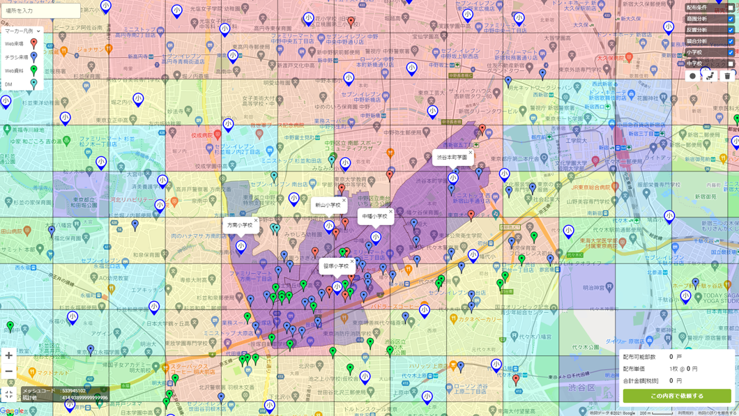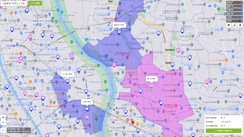 株式会社DEECHは、Google マップから商圏エリアを設定するだけでポスティングの見積もりから発注、商圏分析、反響分析、競合分析までワンストップで行えるエリアマーケティングシステム「DEECH」の開発・販売しています。今回の機能アップデートでは、不動産業界や教育業界で強く要望のあった小・中学校の所在表示と学区表示を追加しました。*小・中学校の所在と学区がワンクリックで表示可能
