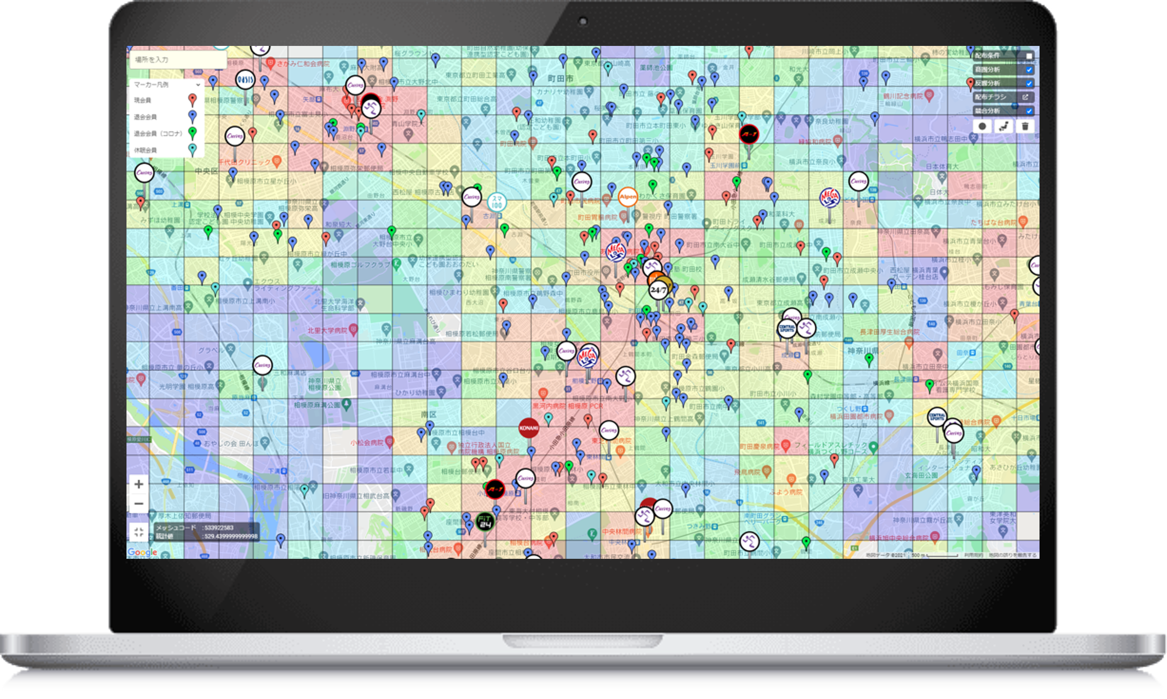 *反響分析機能。販促後に顧客の住所や年齢属性をGoogle マップにピン止めできます