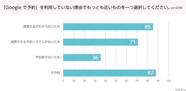 また、「連携できる予約システムがない」と回答した店舗も25.5%となり、コロナ禍の大変なときだからこそ、3密を避けるネット予約の導入を促進し、店舗の運営を支え、店舗への送客を増やすために間口を広げることが重要と考え、エキテンでは「Google で予約」に対応することにいたしました。