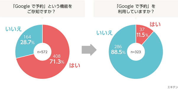 エキテンが、2020年10月にエキテンネット予約を導入している店舗へ実施したアンケートによると、「Google で予約」の認知度は71.3%と高いものの、実際に利用している店舗はそのうち11.5%にとどまっていることがわかりました。
