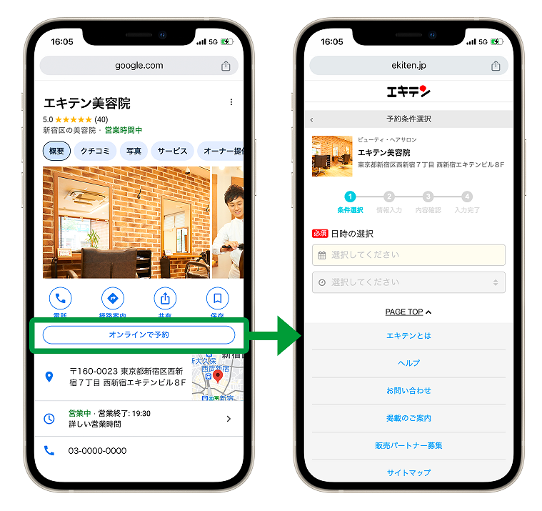 Google 検索やマップ上で予約が完結するフローから、「オンラインで予約」ボタンを押すと「エキテン ネット予約」の予約フローに遷移する形となります。
