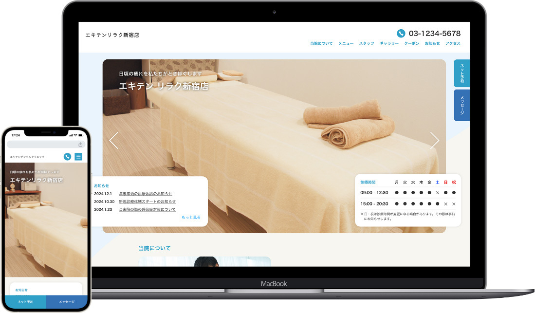 エキテンに掲載された情報をそのまま公式ホームページに反映することができるため、更新が簡単で迅速です。 - デザインテンプレートとカラーをカスタマイズ